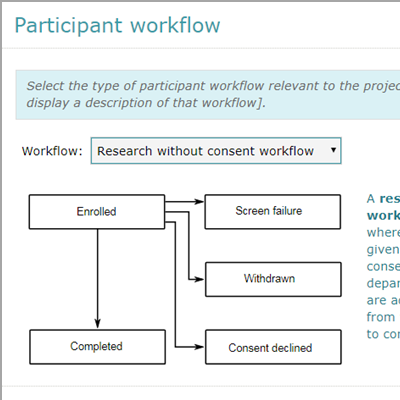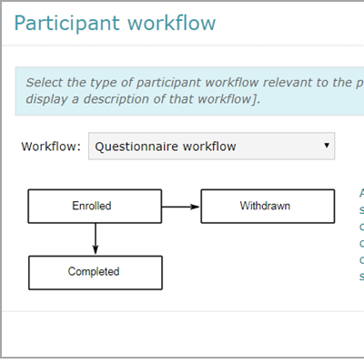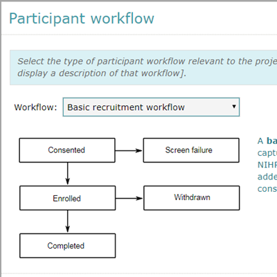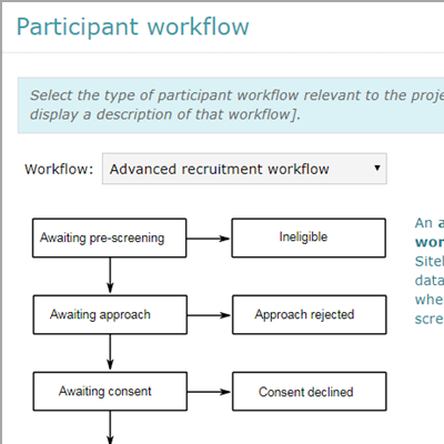 Study teams can configure recruitment workflows so that participants follow a research path that matches their type of study e.g. Questionnaire, Pre-screening, Research without consent. In this way research nurses only maintain participant statuses and data that are needed for the project.